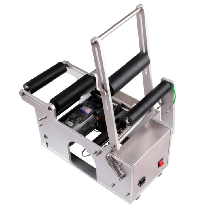 Оператор кладе тару на вали. Після цього притискає тару упором, ємність прокочується роликами і під час цього наклеюється етикетка. Валики працюють за допомогою електроприводу. Спосіб подачі ємності на прокатні ролики – ручний. Подача етикеток здійснюється з рулону, а відпрацьована підкладка після наклеювання етикетки змотується на приводний вал. За допомогою панелі керування можна відрегулювати швидкість вильоту етикеток, інтервал між ними та ін. робочі параметри.
